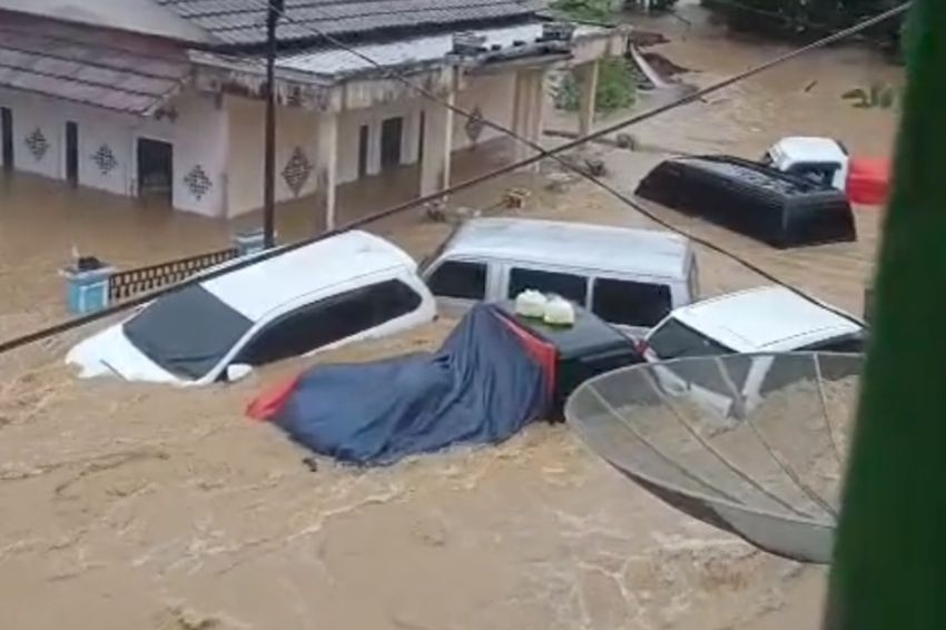 Di akun tersebut, pengguna juga menampilkan video di sebuah permukiman yang memperlihatkan beberapa mobil dan pikap hanyut diseret derasnya arus banjir. Video ini diselingi suara teriakan warga.