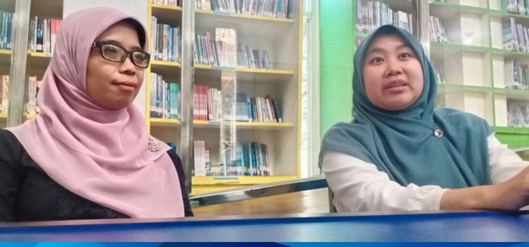 Dua pustakawan ngora, Siti Nur Fauziah (33), ogé katelah Fuji, sareng Sevi Avioni, siap ngabagéakeun sémah di meja resepsionis.
