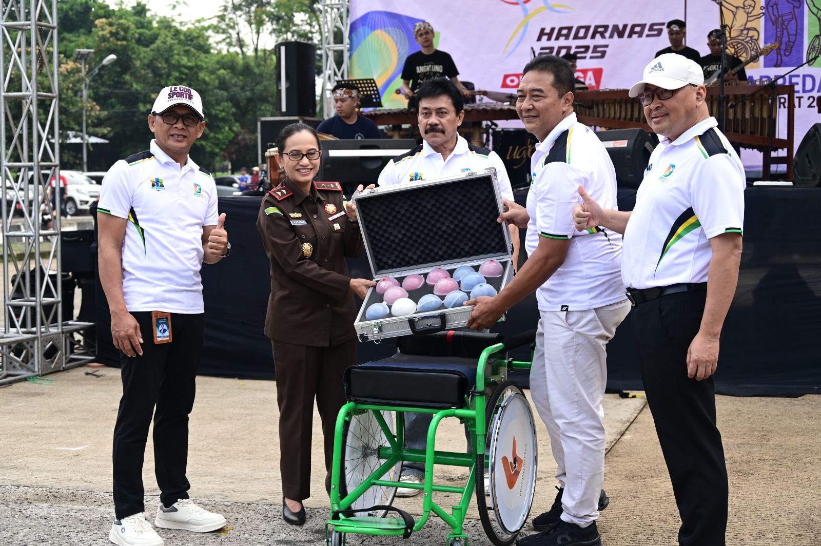Dalam kesempatan tersebut Kajati jabar Endang Sarwestri secara simbolis berkesempatan menyerahkan bantuan berupa alat-alat olah raga kepada perwakilan atlet dari Nasional Paralympic Comitee Jawa Barat.