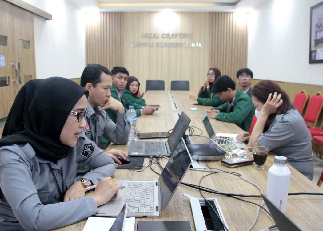 Dari ruang rapat Ismail Saleh, Perancang PUU Anggriana, Erdian dan Shendy serta para Perancang PUU Kanwil Jabar lainnya melaksanakan rapat harmonisasi bersama perwakilan Pemerintah Daerah Kabupaten Kuningan (Pemkab Kuningan) membahas Raperbup tentang Perubahan Pakaian Dinas Kepala Desa dan Perangkat Desa dan Raperbup terkait Perubahan Tata Cara Pemungutan Pajak Air Tanah.