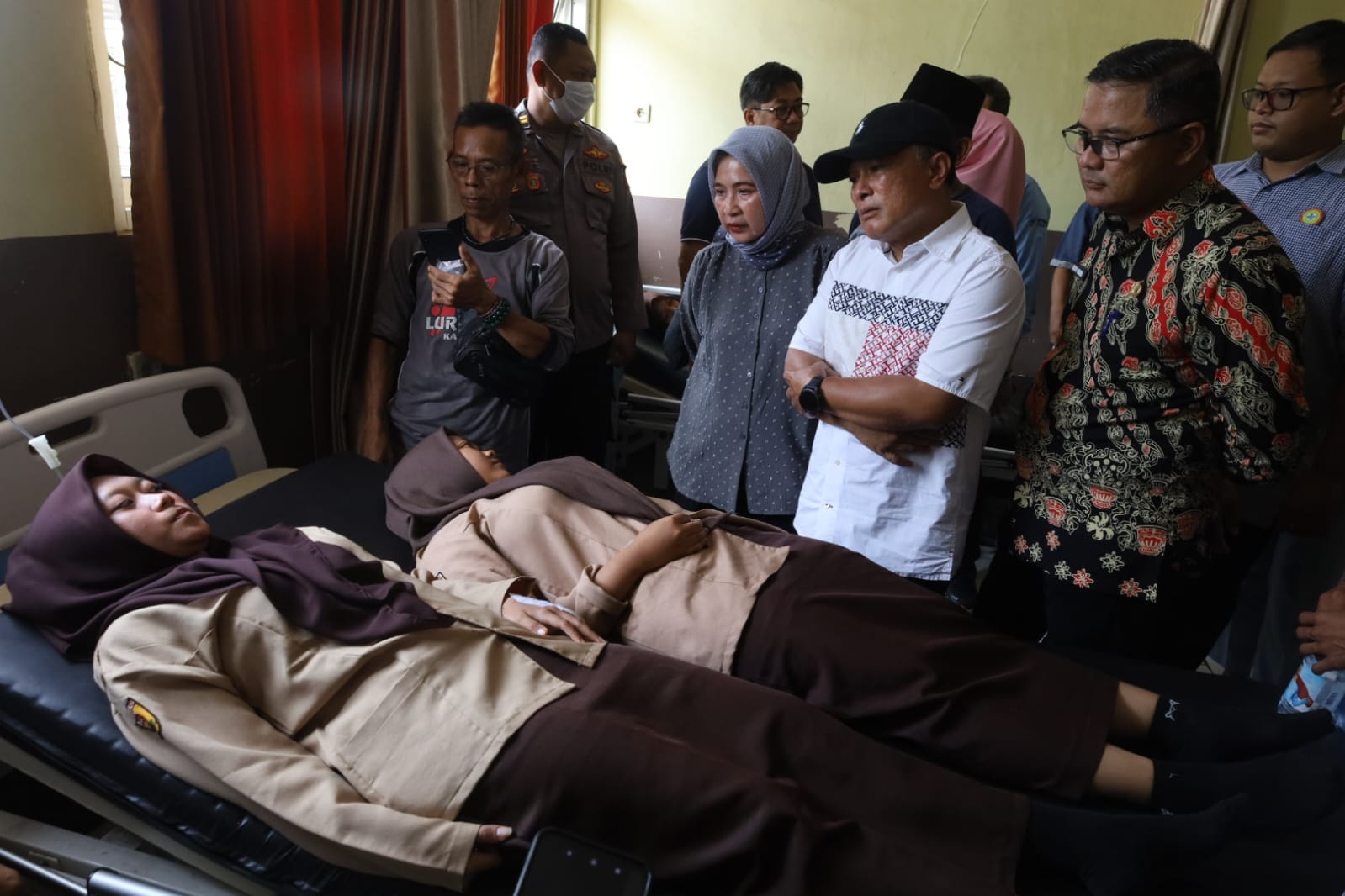 Kunjungan ke Puskesmas tersebut, didampingi Ketua Satgas MBG Kabupaten Kuningan, Dr. Wahyu Hidayah, M.Si., dan kepala OPD terkait, hadir juga Dandim 0615, Kapolres Kuningan dengan langsung menemui siswa yang terbaring, namun tampak ada yang sudah membaik dan dibolehkan pulang.