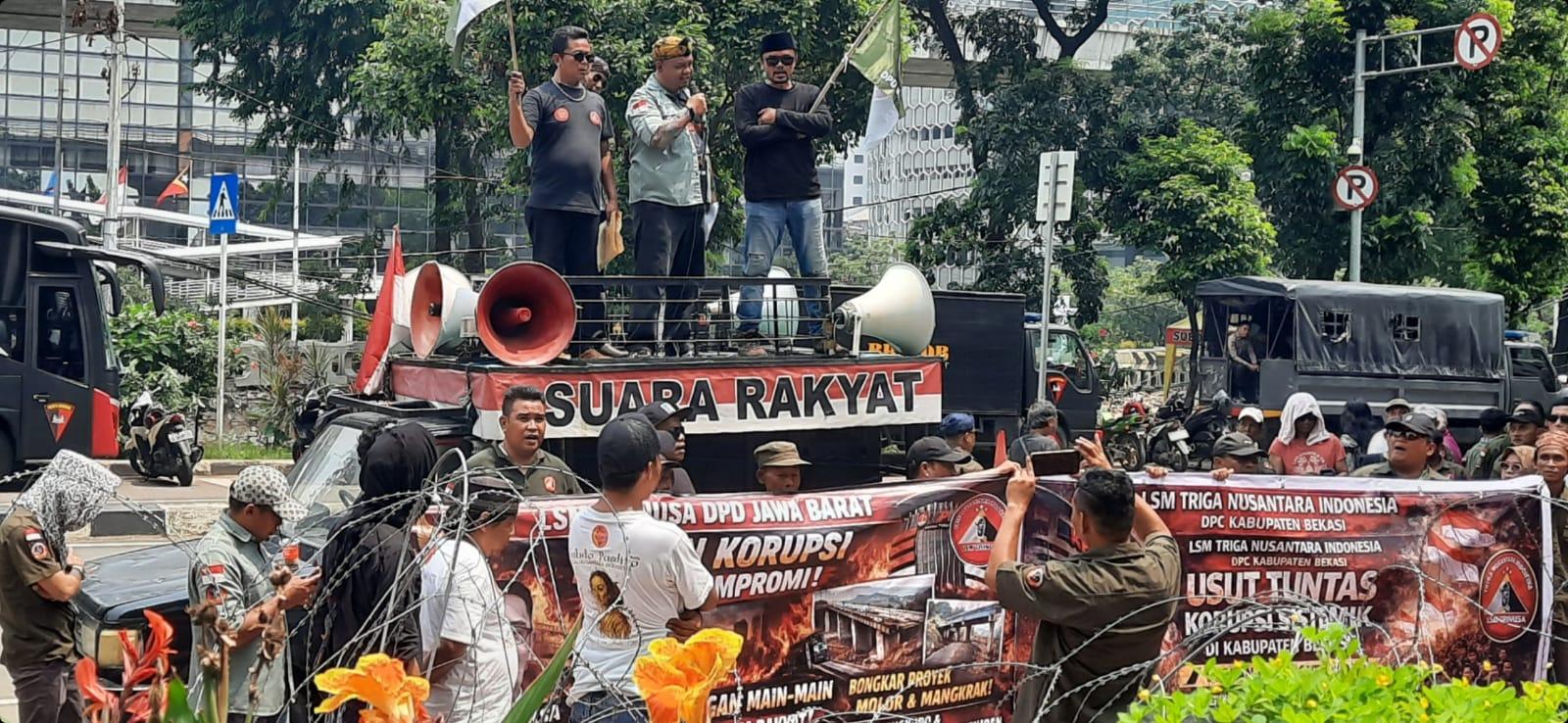 Kali ini Lembaga Swadaya Masyarakat (LSM) Triga Nusantara Indonesia (Trinusa) DPD Jawa Barat (Jabar) menggelar aksi demo di Gedung Komisi Pemberantasan Korupsi (KPK) di Jakarta, Selasa, 21 April 2026.