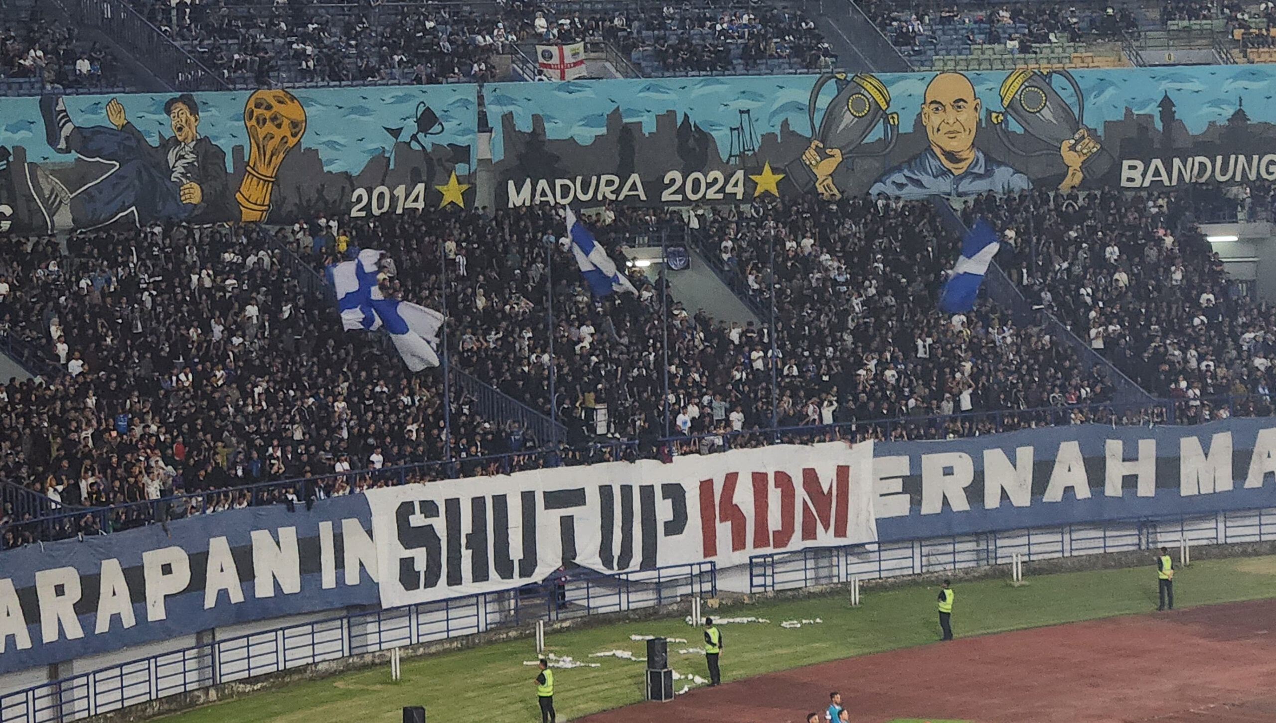 Banner dengan tulisan ‘Shut Up KDM’ terbentang dengan jelas dari sisi utara stadion.